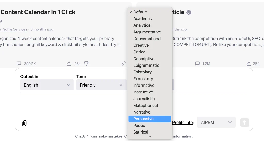 Choosing a style or tone from these menus tailors ChatGPT’s responses to consistently reflect your selected voice throughout your session. If no specific style or tone is chosen, AIPRM defaults to its standard mode. But with a selection, your communication gains a consistent, distinctive character, ensuring every interaction is in harmony with your brand’s unique voice.
