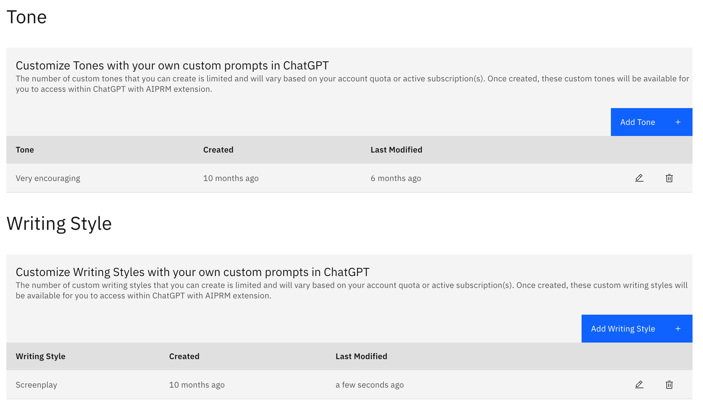 Customizing AIPRM to match your unique brand voice and tone is a breeze. It’s all about personalization. Head over to your account page and scroll down to find the sections for ‘Tones’ and ‘Writing Styles’. Here’s where you add your own flavor.
