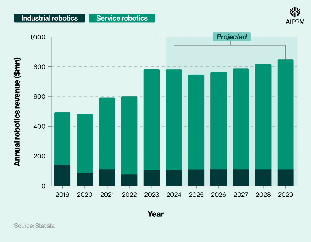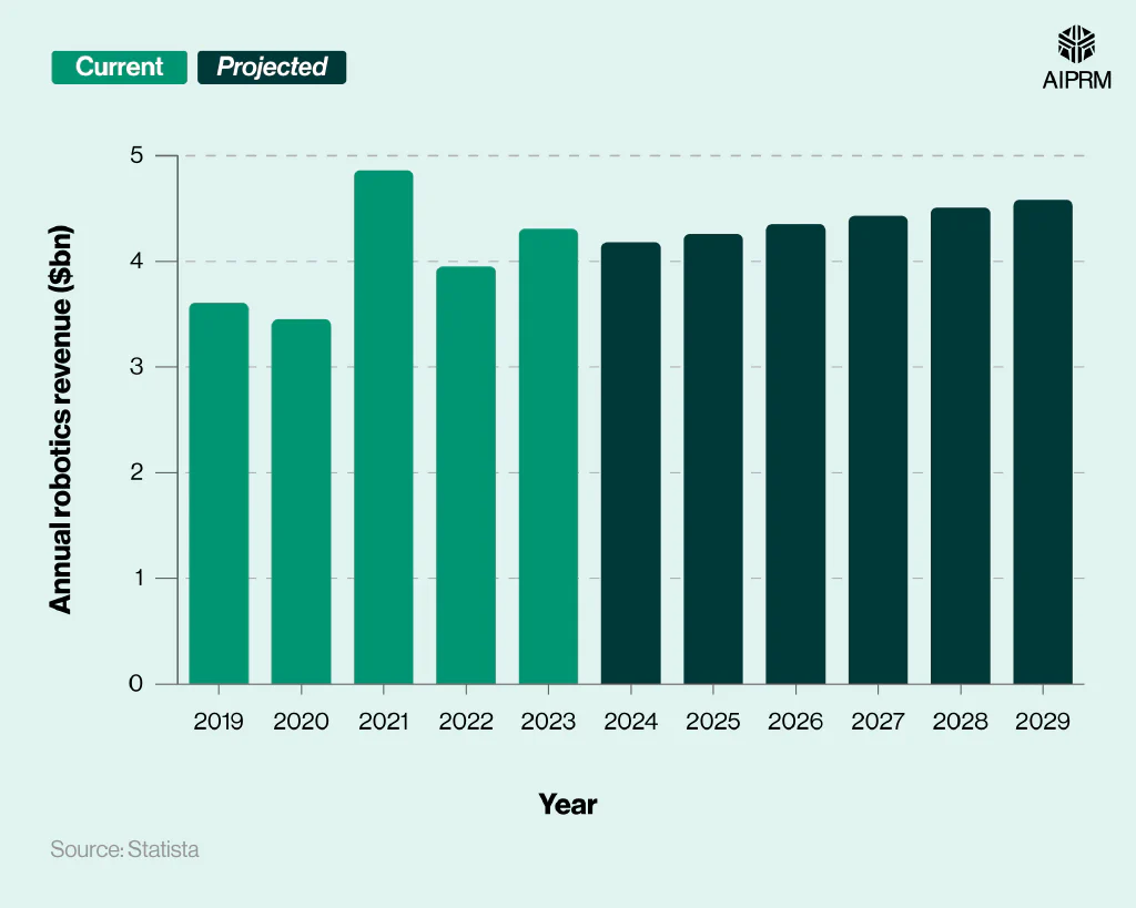 By 2029, the industrial robotics industry is forecasted to see a 2.6% rise in its global revenue figures YoY, with respective figures anticipated to be almost four times higher in the service robotics sector.