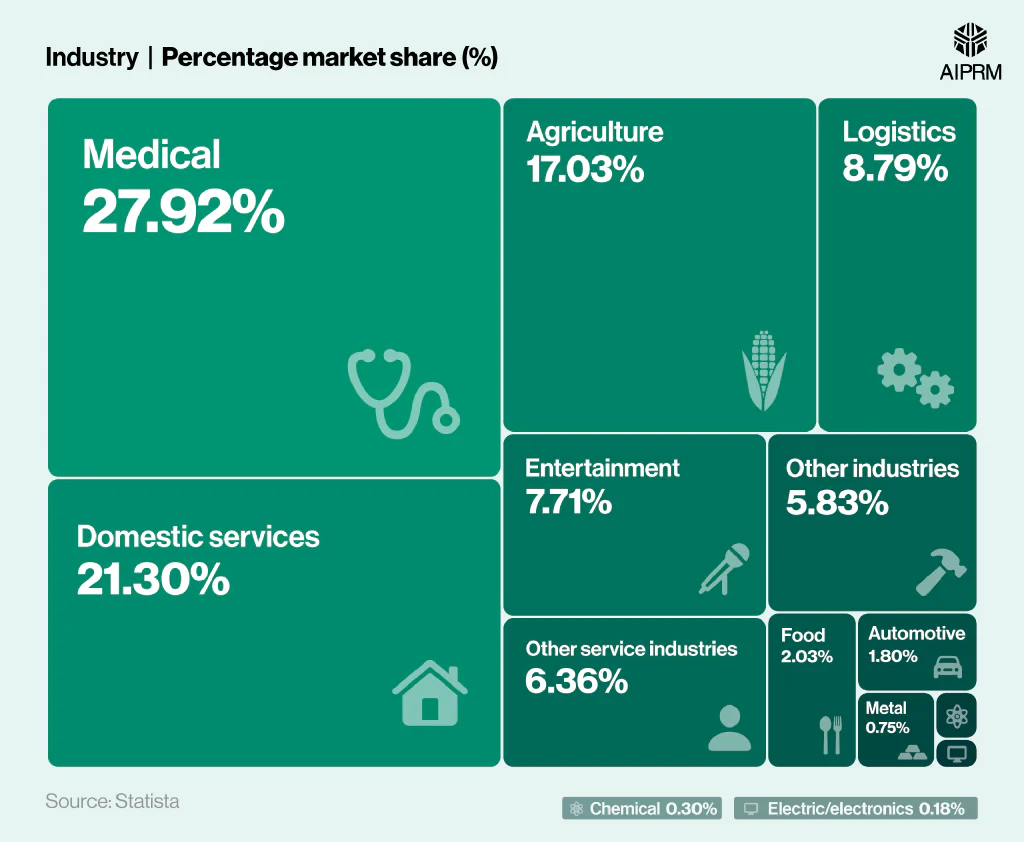 Robotics market statistics indicate that domestic services is the second-biggest area, occupying just under a fifth (19.76%) of the overall industry. This was followed by other service industries (10.28%) and entertainment (9.29%), with each accounting for around a tenth of the total.