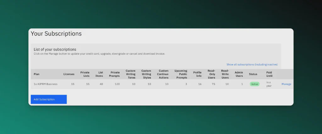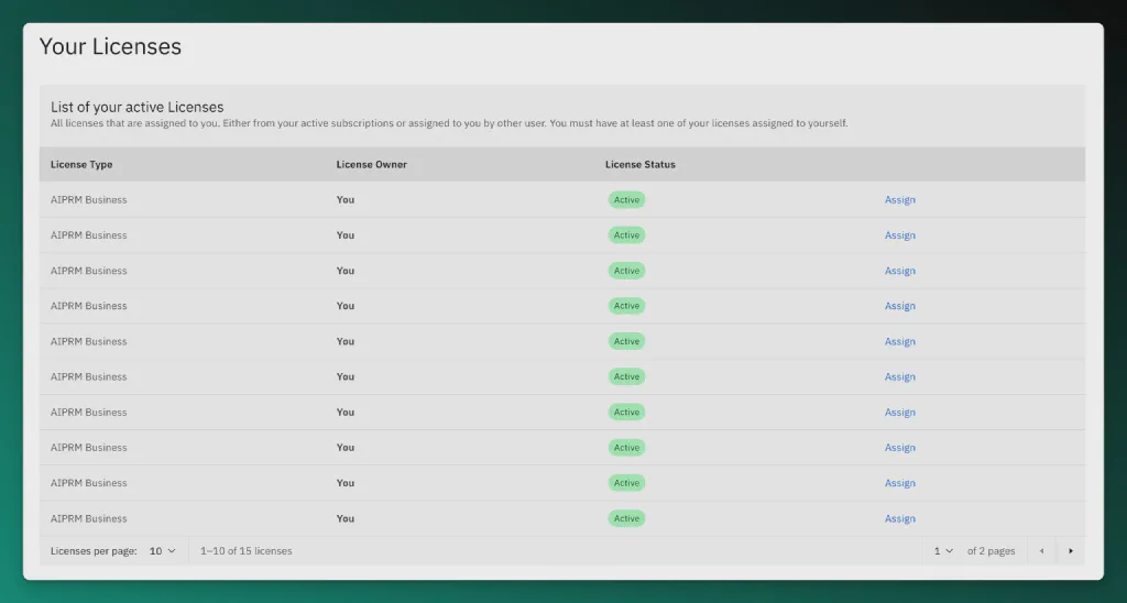 Schermafbeelding van toegewezen licenties in AIPRM (AIPRM-Assigned-Licenses-1-scaled.webp)